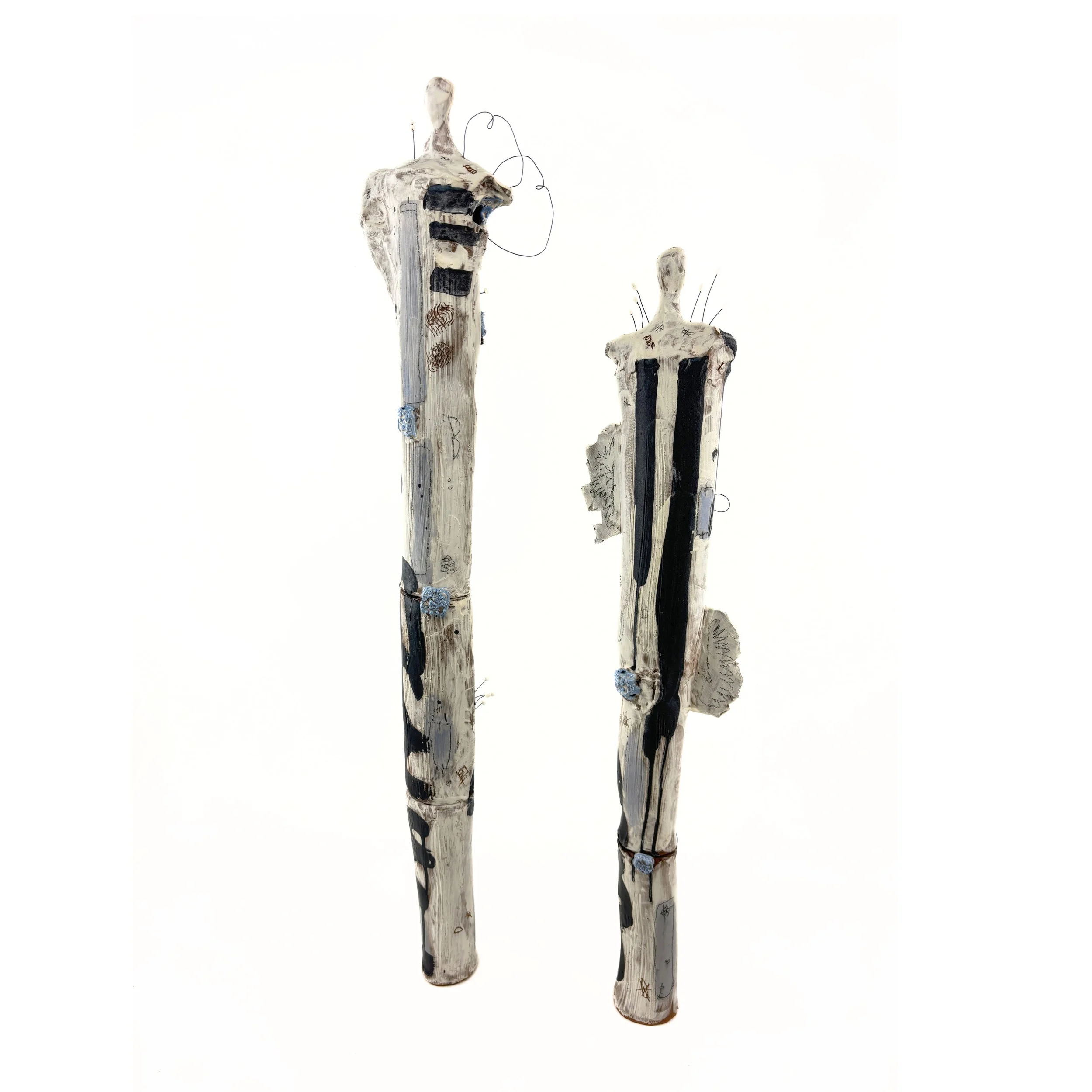 Beth’s Artist statement: The core of my art practice has been working with clay for the past decade, but my longer term creative endeavors encompass sculpture, painting, and installation art. My clay pieces are sculptural as well as illustrative, and they are driven instinctively by the connections that I see occurring as the work is created. I work from the forms arising during hand building and throwing, and alter these forms by disassembling and reassembling them, working with the pieces until the forms resonate with me internally. The addition or subtraction of illustrative layers, subtle textures, the application of handles or addition of artifacts arising from cutting apart my clay vessels gives each object an individual and identifiable sense of space, while reducing the vessel and its surface design to simple, modest, representational forms. Some of my clay vessels are basic shapes that I slip cast to create a blank canvas for painting and scratching landscapes and conversations onto the clay. Other materials and mixed media find their way into my sculptural work with or without the balance of clay. I work often in series, chasing a feeling until it can be resolved and reflected in the vessel and in nuances revealed by repetition in the series. It is this process of making that I am most connected to.